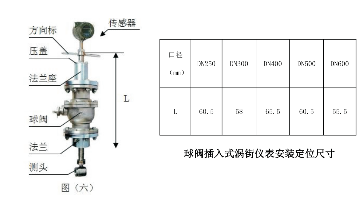 2.3將DN50球閥安裝到安裝底座上。注意球閥的長(zhǎng)空腔向上,檢査球閥是否能全開全關(guān)。如有問(wèn)題應(yīng)進(jìn)行修理將壓緊螺紋座、壓緊螺母和橡膠密封圈安裝 到球閥上。松開定位螺釘和壓緊螺母,將傳感器插入桿通過(guò)球閥插入被測(cè)管道。插入 深度由H4計(jì)算,并由游標(biāo)卡尺或鋼卷尺測(cè)量,符合要求后,上緊壓緊螺母和定位螺 釘,同時(shí)應(yīng)注意傳感器方向標(biāo)志桿指向應(yīng)和流體流向一致